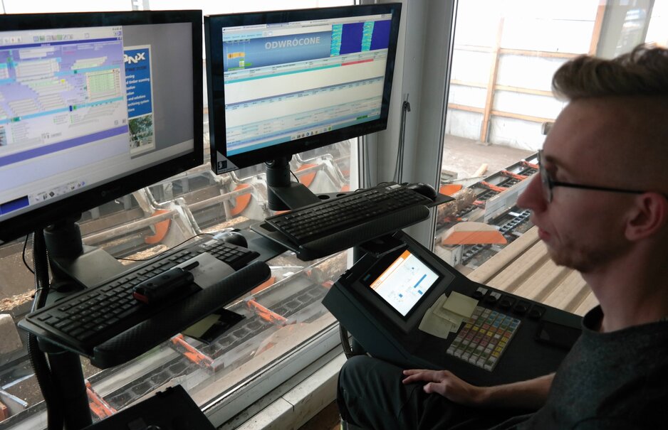 Ende 2019 wurde der Prototyp eines Logeye 300 Scanners von Microtec installiert, der die geometrischen, optischen und strukturellen Eigenschaften des Holzes bestimmt und innere Defekte des Rohmaterials erkennt. Das Ergebnis sind Farbbilder von Querschnitten jedes Stammes, die der Bediener der Anlage – ein qualifizierter Sortierer – auf Monitoren sehen kann. Innerhalb von Sekunden trifft er die Entscheidung, den Stamm einer bestimmten Holzklasse zuzuordnen.