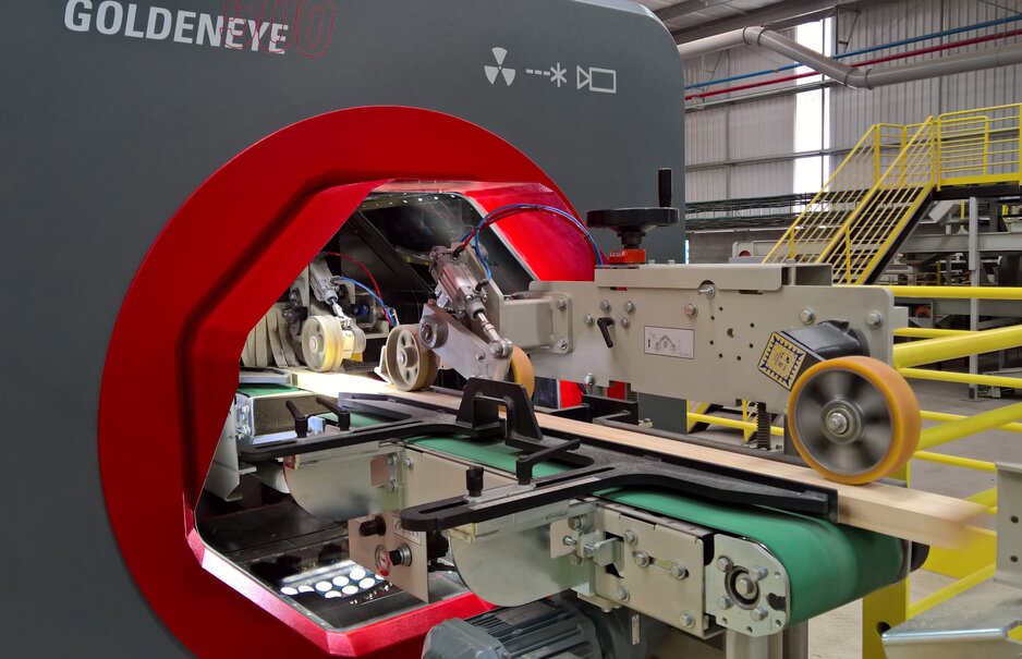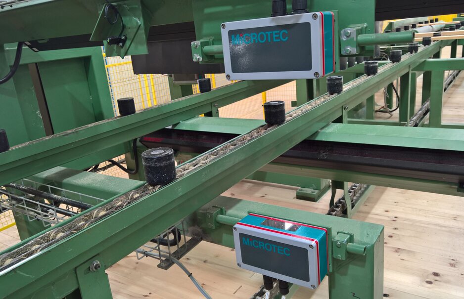 Die SPS-Programmierung und Steuerung am Rundholzplatz und an der Sägenlinienzubringung stammen von Microtec. Der Sägenvorschub besteht aus einem Hochgeschwindigkeits-Zuführdeck mit integriertem Abfallbeseitigungssystem. Vier Logeye 3D-Scanner werden mit der Maxicut-Software kombiniert, um eine Zerlegung der Stämme nach vordefinierten, optimal passenden Schnittmustern zu ermöglichen. Das von Microtec gelieferte Screenlog-System erfüllt eine sehr spezifische Aufgabe, nämlich die visuelle Erkennung der Markröhre an der Ober-/Unterseite der Stämme. Für die Nasssortierlinie erkennen zwei hochpräzise Microtec Optiside-Scanner den Becher, die Markröhre und das Aussehen der Jahresringe an beiden Enden des Brettes. Bretter mit sichtbarer Markröhre an den Enden werden in einen anderen Behälter aussortiert. Das Programm Variosort wird mit der Messung von Länge, Breite und Dicke kombiniert.
