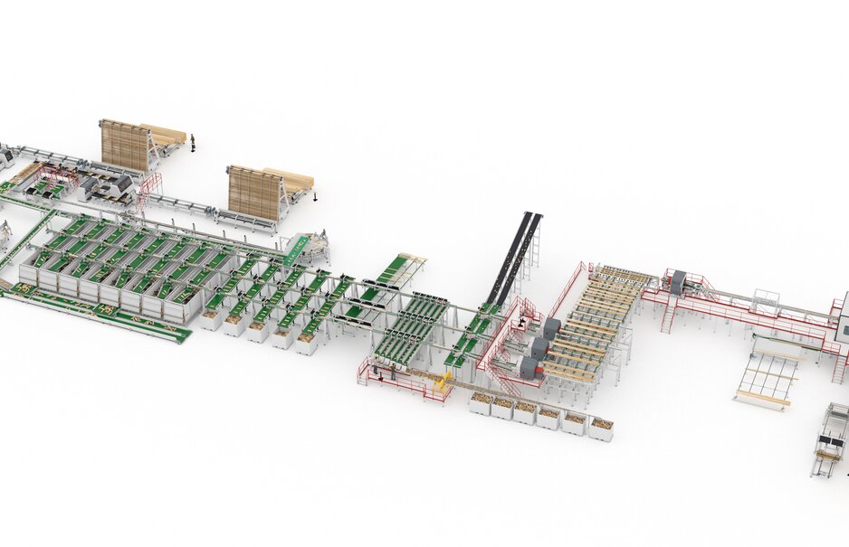 Die Zuführung der Pakete erfolgt zunächst über einen Kippzug, der zwei Pakete übereinanderlegt. Dann werden die Werkstücke mit bis zu 60 Werkstücken/Minute einer 250 Meter langen Ledinek-Hobelmaschine mit 4 Spindeln zugeführt. Als nächstes werden die Werkstücke mit einem Microtec Warpscan 3D Brettscanner auf Formabweichungen untersucht, der Krümmung, Verdrehung und Biegung misst. Ein MiCROTEC Endscan-Scanner prüft außerdem die Jahresringe der Bretter, um das Kernholz der Werkstücke zu identifizieren.