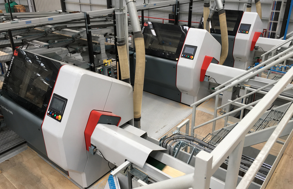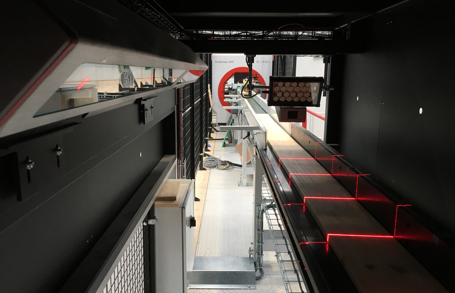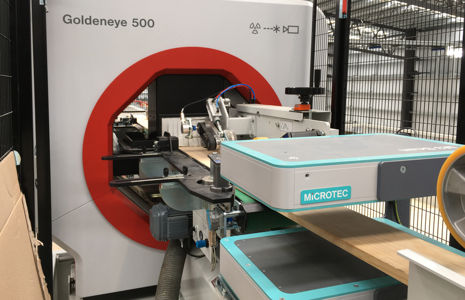Ein MiCROTEC M3 Scanner bestimmt den Feuchtigkeitsgehalt der Werkstücke, bevor diese auf allen 4 Seiten von einem Goldeneye 500 Multi-Sensor Qualitätsscanner mit Röntgeneinheit gescannt werden. Die Goldeneye-Optimierungssoftware errechnet dann die beste Schnittposition sowohl für die Kapp- als auch für die Spaltoptimierung. Diese Daten werden von den drei nachfolgenden Kappsägen Opti-Kap 5103 genutzt. Sobald die Werkstücke in die Kappsägen einlaufen, weist die Optimierungssoftware die Sägen an, wie sie die Werkstücke für eine maximale Holzausnutzung schneiden müssen.