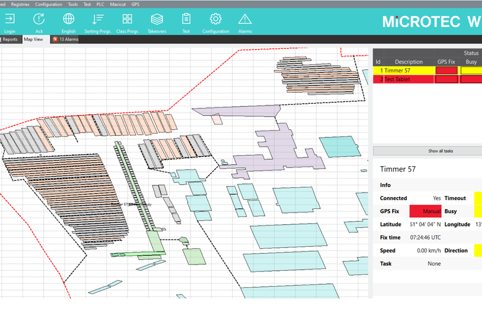 All existing installations at the logyard, such as sorting boxes, polters or the position of the log feed at the saw, are linked to geo-referenced objects and accurately mapped on the digital map. Visualization on the map means that employees - from production planners to loader operators - have all the data clearly at their fingertips in real time. In addition to information on the current status of the logyard, data on the handling machines, including their drivers, can be collected. Each vehicle can thus be precisely assigned when, where and, above all, how many kilometers were covered in a defined comparison period, for example a shift. "Now we finally have sound data that enable us to apply an additional optimization lever here," Zimnickas is convinced of the solution. Geolocation is made possible by means of radio antennas. The precise location information, together with the current employment status of the individual loaders, enables new tasks to be distributed to employees in real time via intelligent software based on the actual status at the logyard.